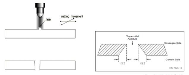 激光切割原理如下左图所示,其切割过程由机器精细控制,适用超小间距开孔的制作。由于是由激光直接烧蚀而成,所以其孔壁比化学蚀刻的孔壁直,没有中间锥形形状,有利于锡膏填充网孔。而且由于是从一面向另一面烧蚀,所以其孔壁会呈现自然的倾角,使得整个孔的剖面呈倒梯形结构(如下右图所示),这个锥度大概也就相当于钢片厚度一半。