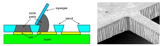 由于化学蚀刻是从钢片的两面同时作用去除金属部分(如下左图),其孔壁光滑,垂直,但是可能会在钢片厚度中心部分不能完全去除金属而形成锥形形状,其剖面呈水漏形状(如下右图),这种结构不利于锡膏释放。所以,蚀刻钢网一般不建议应用于精密元件组装。通常元件引脚间距(Pitch)小于0.5mm,或0402以下尺寸元件不建议采用蚀刻钢网。当然一些大型元件或Pitch值较大的元件组装,蚀刻钢网有较大的成本优势,同时也能满足许多SMT贴片加工厂对于生产质量的要求。