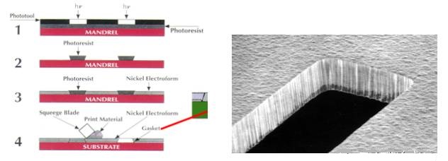 基板上涂感光膜→制作芯轴→电镀镍在芯轴周围生成钢片→剥离清洗→检查→绷网→包装
