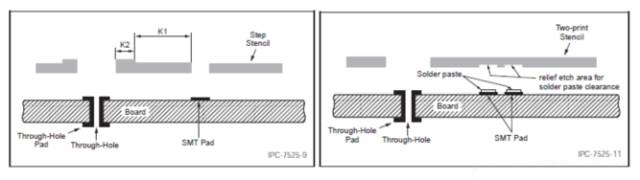 阶梯钢网有两种类型,Step-up和Step-down,两种类型的制作工艺基本上是一样的,而到底是Up还是Down,则取决于所需要改变的局部是增加厚度还是减少厚度。如果为了满足大板上局部小间距元件(如大板上CSP)的组装要求,板上大部分元件需要较多的锡量,而对于小间距的CSP或QFP类元件,为了防止短路则需要减少锡量,或者需要做避空处理,这就可以采用Step-down钢网,对于小间距元件位置的钢片进行减薄处理,让此处的钢片厚度小于其它位置的厚度。同理,对于一些精密板上的少量大引脚元件,由于钢片整体厚度较薄,焊盘上沉积的锡膏量就可能不足,或对于穿孔回流工艺,有时需要在通孔内填充更大的锡膏量以满足孔内焊料填充要求,这就需要在钢网的大焊盘或通孔位置增加钢片厚度以增加锡膏沉积量,这就需要采用Step-up钢网了。在实际生产中,究竟选择哪一种钢网,我们需要根据板上元件的类型和分布来确定。